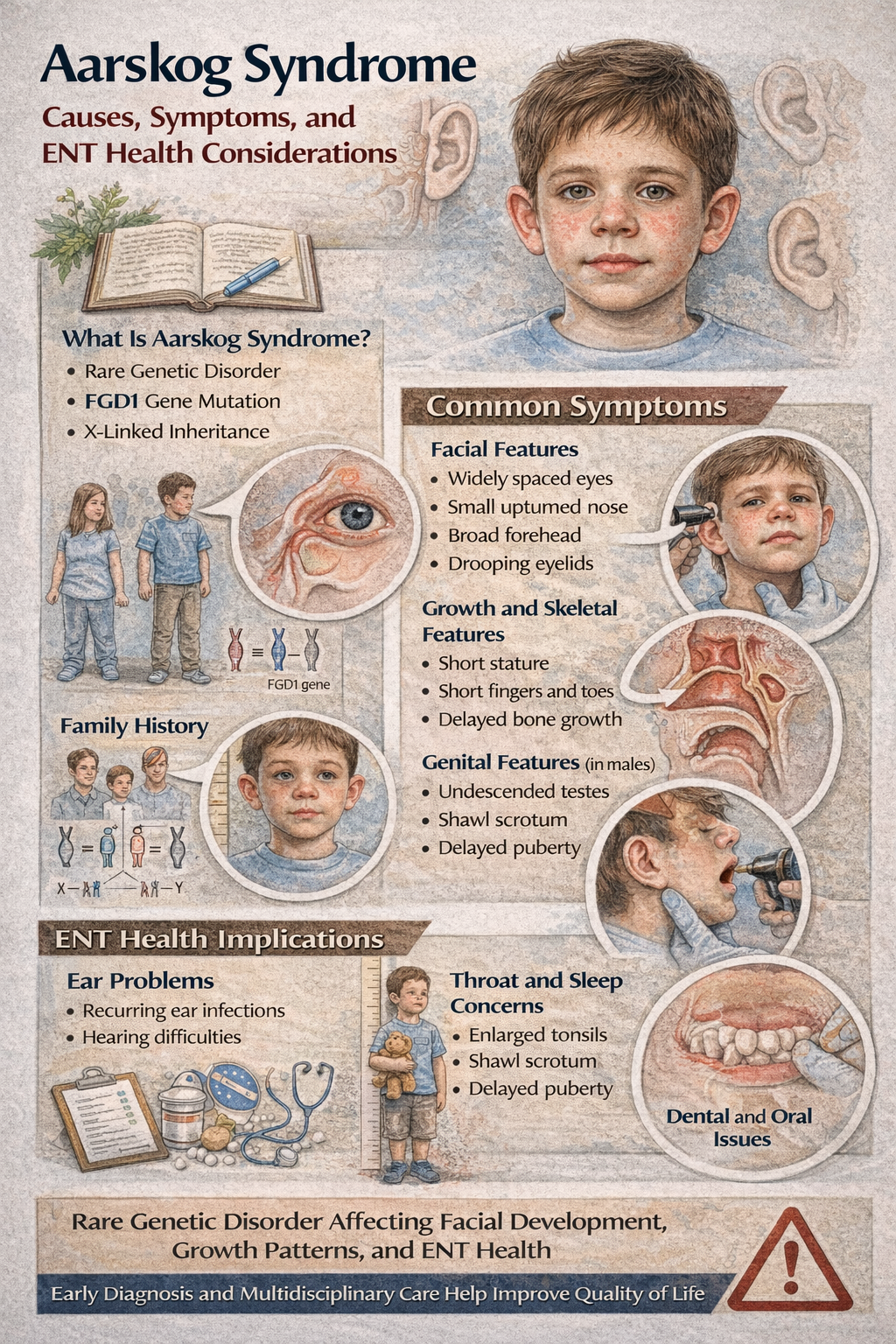 Aarskog Syndrome is a rare genetic disorder affecting facial development, growth, and ENT health. Early diagnosis, hearing care, and multidisciplinary...