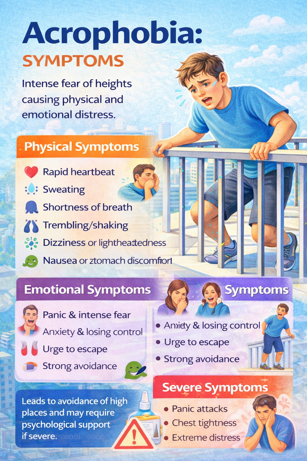 Acrophobia is an intense fear of heights causing dizziness, rapid heartbeat, sweating, anxiety, and panic. It can lead to avoidance of high places and...