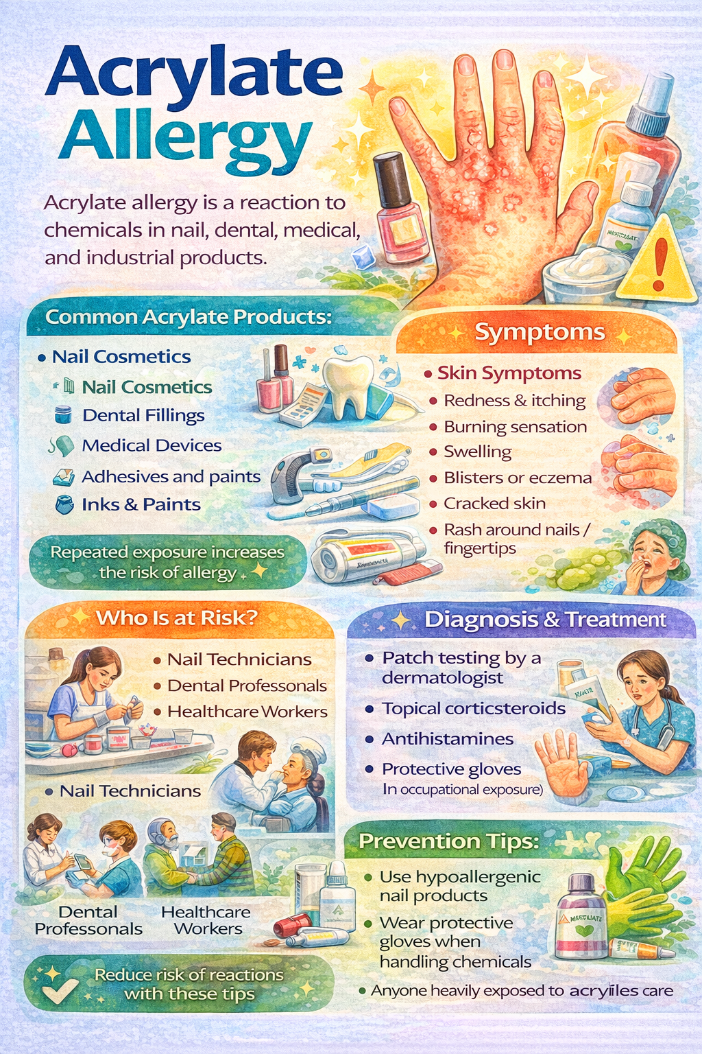 Acrylate allergy is a contact reaction caused by exposure to chemicals used in nail products, dental materials, adhesives, and medical devices. It com...
