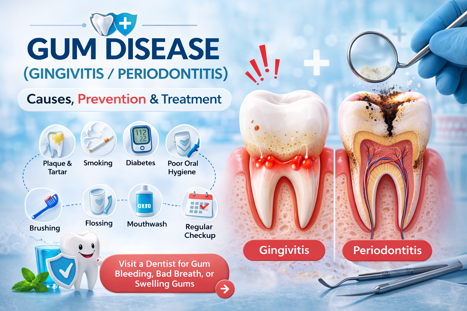 Learn about gum disease, including gingivitis and periodontitis, their causes, symptoms, prevention, and treatment options. Discover how proper oral h...